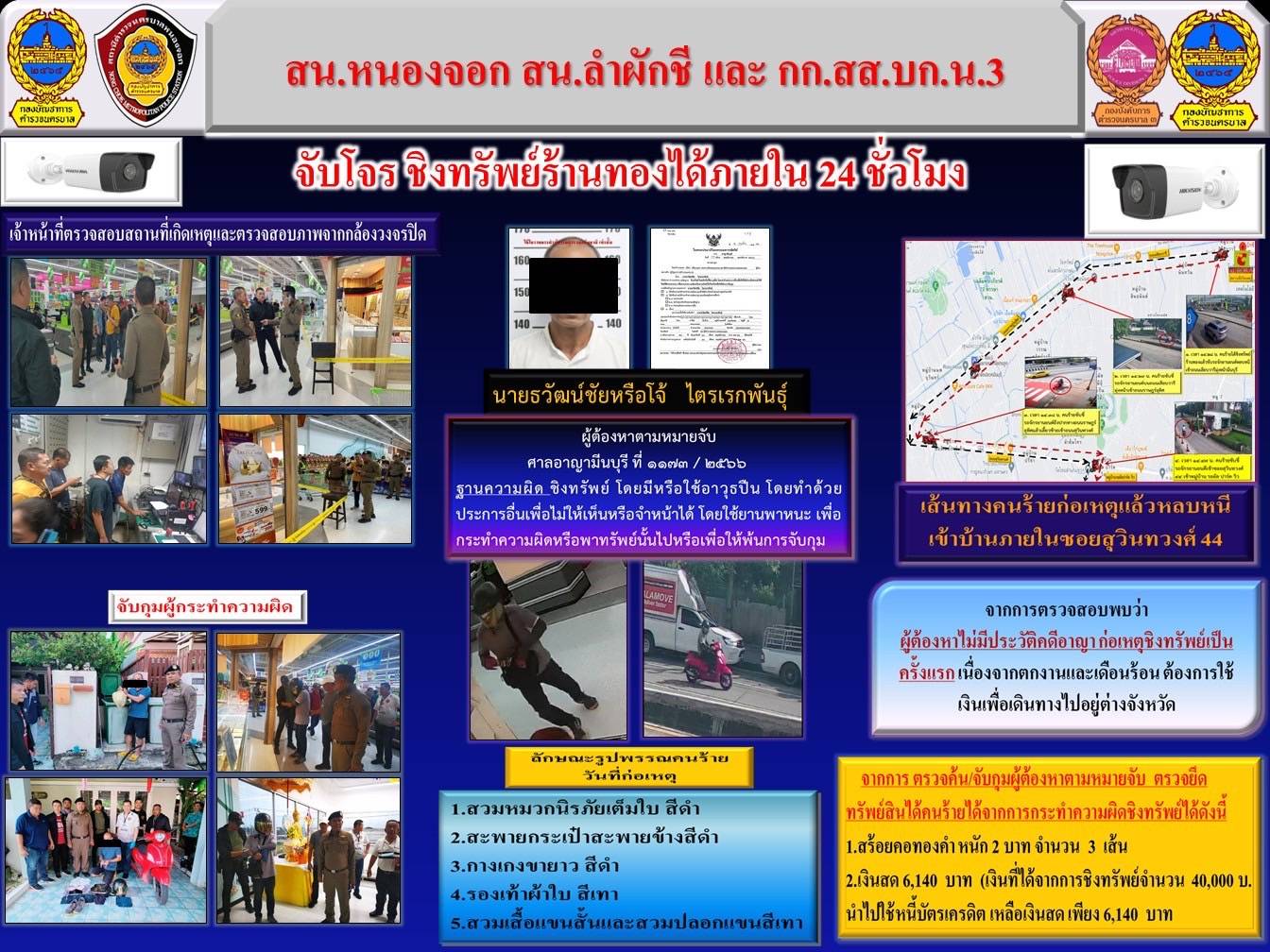 อายุ 54 ปี ที่อยู่ 61/282 หมู่ที่ 2 แขวงลำผักชี เขตหนองจอก กรุงเทพมหานคร เจ้าหน้าที่ตำรวจฝ่ายสืบสวนสน.หนองจอก จึงรวบรวมพยานหลักฐานทั้งภาพถ่ายจากกล้อง CCTVและเอกสารที่เกี่ยวข้องทั้งหมด นำส่งให้พนักงานสอบสวน สน.หนองจอก และพนักงานสอบสวนได้รวบรวมพยานหลักฐานขออนุมัติหมายจับผู้ต้องหาดังกล่าวต่อศาลอาญามีนบุรี และศาลอาญามีนบุรีอนุมัติหมายจับตามหมายจับที่จ.1173/2566