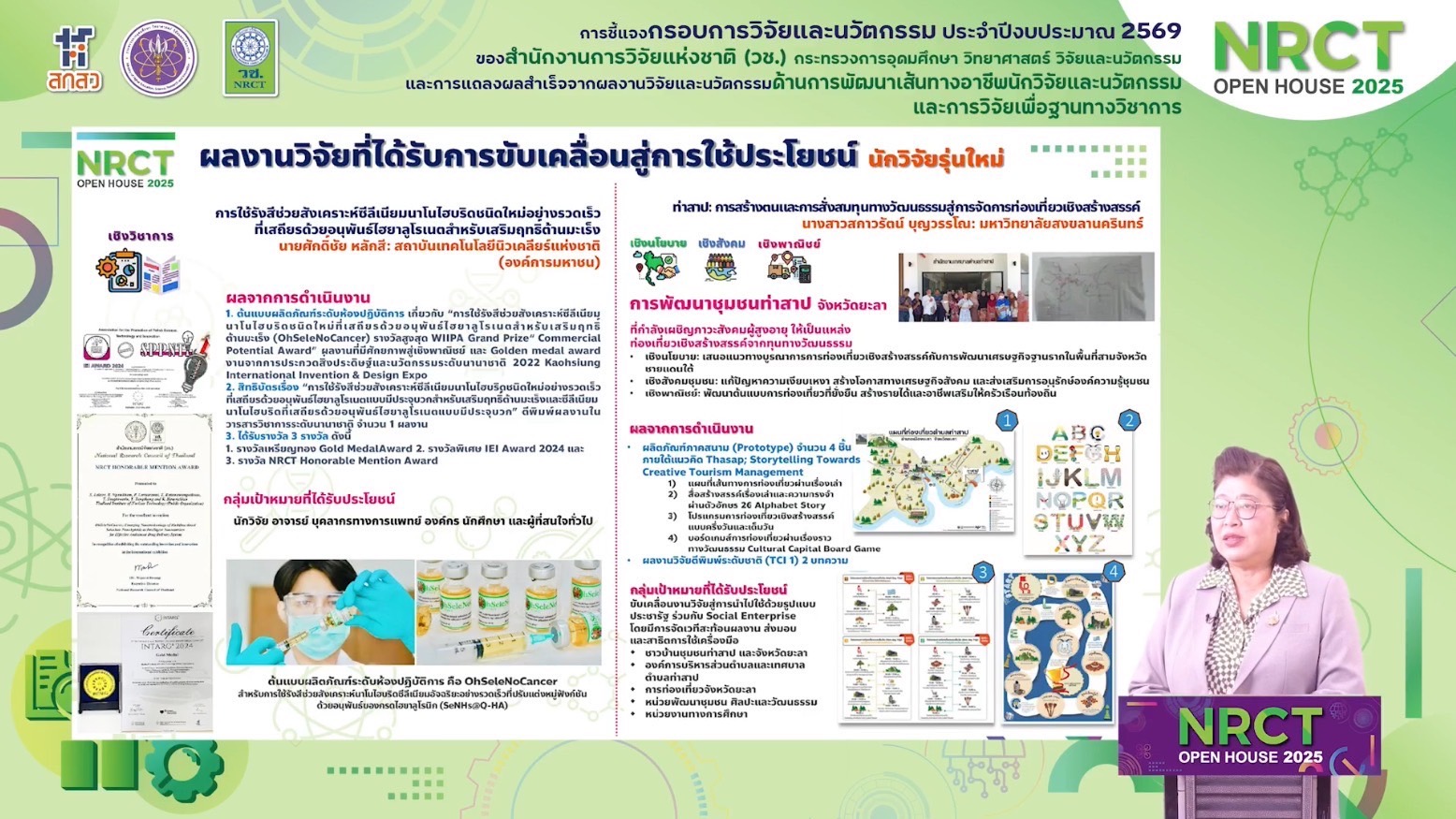 ดร.วิภารัตน์ ดีอ่อง ผู้อำนวยการสำนักงานการวิจัยแห่งชาติ (ผอ.วช.) กล่าวว่า (วช.) ภายใต้กระทรวง (อว.) ในฐานะหน่วยงานหลักด้านการบริหารทุนวิจัยและนวัตกรรมของประเทศ ได้ให้ความสำคัญกับผลสัมฤทธิ์จากการวิจัยที่สามารถนำไปใช้ประโยชน์ได้จริงในหลากหลายมิติ โดยมีเป้าหมายสำคัญในการผลักดันให้งานวิจัยสร้างผลกระทบเชิงบวกอย่างเป็นรูปธรรม ทั้งด้านเศรษฐกิจ สังคม และวิชาการ โดยเฉพาะการมุ่งเน้นเป้าหมายการวิจัยและนวัตกรรมในประเด็นสำคัญ เช่น การพัฒนาเส้นทางอาชีพของนักวิจัยและนวัตกรรม และการวิจัยเพื่อเสริมสร้างฐานทางวิชาการที่มั่นคง ซึ่งเป็นรากฐานสำคัญในการพัฒนาประเทศอย่างยั่งยืน